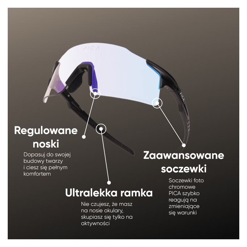PICA ORRU zapewniają komfort i ochronę podczas aktywności fizycznej. Soczewki fotochromowe automatycznie dopasowują się do warunków oświetleniowych, a filtr UV400 chroni oczy przed promieniowaniem UVA/UVB.